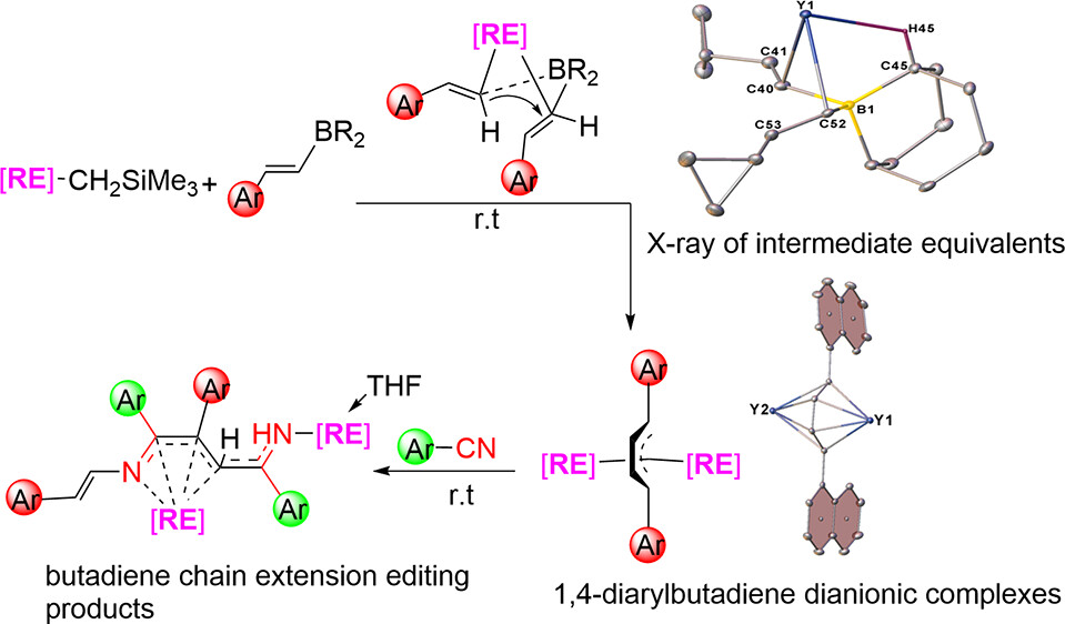 Aryl and vinyl boron reagents are widely employed in modern organic synthesis. However, the direct coupling of nucleophilic vinyl boron reagents to construct conjugated 1,4-diarylbutadiene dianionic (DABDA) motifs in the absence of additives remains a significant challenge. Here, we report for the first time the direct coupling of various β-aryl vinyl boron reagents, initiated by the rare-earth metal monoalkyl complexes for the synthesis of a number of rare-earth metal complexes featuring inverse sandwich DABDA motifs. Isolation of key intermediates (or intermediate equivalents) and theoretical results provide mechanistic insights involving deboronative transmetalation, followed by 1,2-metalate shift of the vinyl group of the metal-bonded tetracoordinate borates, and deboronation. DFT calculations indicate that the singlet state, with two electrons in the butadiene π* orbital, is more stable than the triplet state, where the electrons are localized in the π* orbitals of the aryl and butadiene parts. The variable-temperature magnetic susceptibility further confirmed this result. The DABDA complexes exhibit unprecedented redox reactivity in their reactions with unsaturated compounds including bipyridine, azobenzene, trimethylsilyl azide, imines, ketones, and nitriles. Notably, a butadiene chain extension editing process was also unveiled upon treatment of the DABDA complexes with aromatic nitriles.