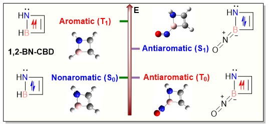Controlling aromaticity across electronic states is crucial for designing novel species. While aromaticity typically could be achieved in either the lowest singlet state (S0) or the lowest triplet state (T₁), dual-state aromaticity or antiaromaticity remains less developed. Herein, we demonstrate that NO-substitution uniquely induces antiaromaticity in both S0 and T1 states of 1,2-BN-doped cyclobutadiene (1,2-BN-CBD), initially nonaromatic in S0 and weakly aromatic in T1.